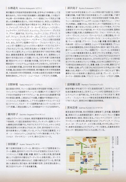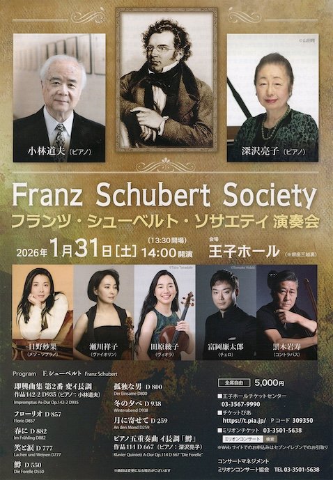 2026年1月31日(土)14:00開演 フランツ・シューベルト・ソサエティ演奏会 2025.9.29 Consertコンサート情報 フランツ・シューベルト・ソサエティ演奏会日時2026年1月31日(土)14:00開演会場銀座・王子ホール(〒104-0061 東京都中央区銀座4丁目7番5号)曲目シューベルト:ピアノ五重奏曲 イ長調「鱒」作品114 D667 他出演者日野妙果(MzS) 瀬川祥子(Vn) 田原綾子(Va) 富岡廉太郎(Vc) 黒木岩寿(Cb) 深沢亮子(Pf) 他入場料¥5,000お問い合わせ先深沢亮子後援会事務局 080-8290-5699(高橋)ミリオンコンサート協会 03-3501-5638 前の記事へ 一覧へ戻る 次の記事へ